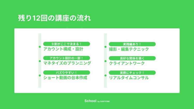 SAKIYOMIスクールは、SNS運用代行のノウハウを基礎から学ぶことができるスクールです。業界最大手のSNS運用代行会社であるSAKIYOMIだからこそ提供できる、再現性の高いノウハウが詰まっています。
