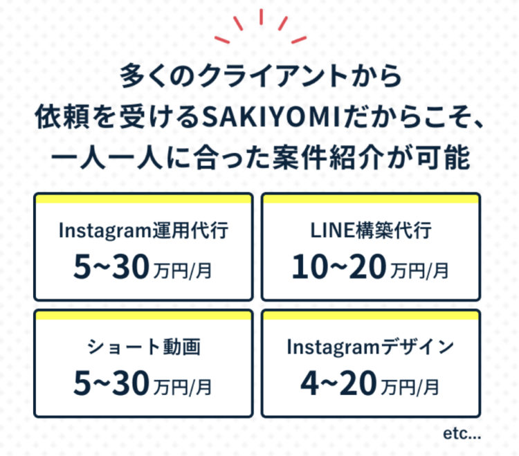 3つ目は、学習から案件獲得まで一貫してサポートしてくれる体制です。SAKIYOMIには毎月1,000件以上のSNS支援に関する問い合わせがあり、一定の条件を満たした受講生には実際の案件を紹介してくれます。