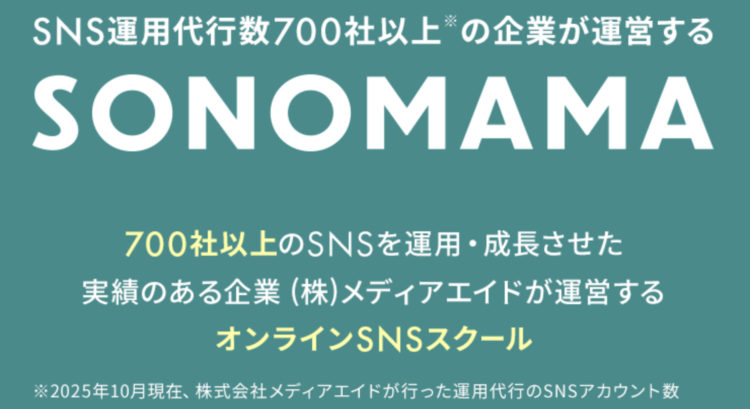 結論からお伝えすると、SNSオンラインスクール『SONOMAMA』は、SNSマーケティング業界最大手の一つである「株式会社メディアエイド」が運営する、実践的で信頼性の高いスクールです。
