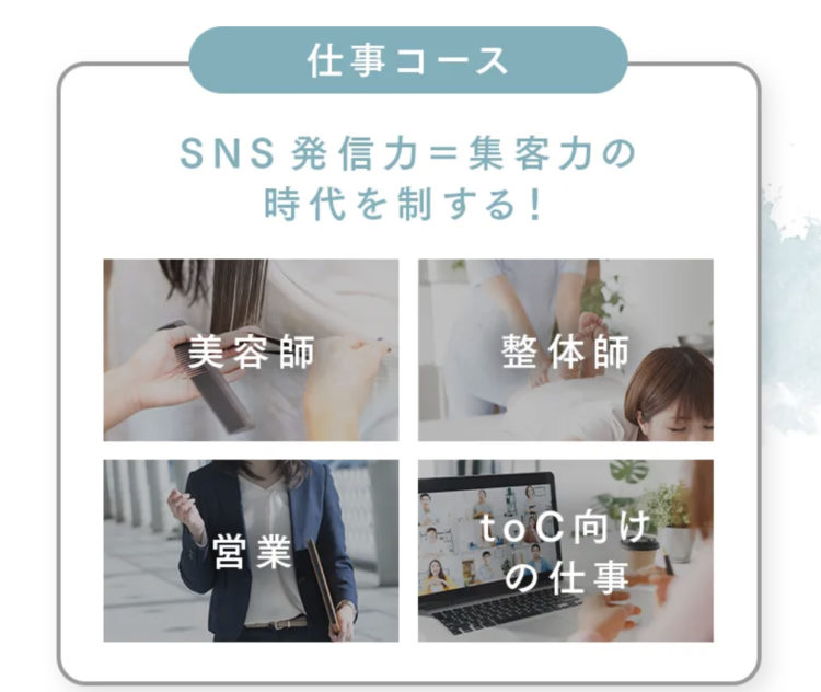 仕事コース(7ヶ月プラン)![]() | SNS発信力を「集客力」に直結させたいフリーランスや個人事業主向け。ビジネスに特化した運用設計や、顧客獲得への導線作りを深く学びます。 | 24,600円/月~ |