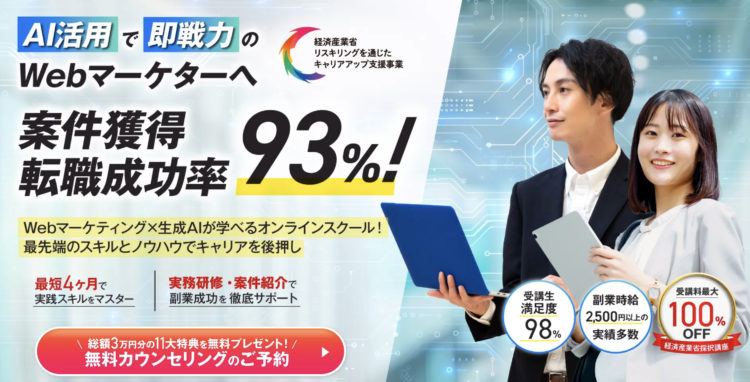 WEBMARKSのSEO・広告・AIのスキルを同時に習得できる超実践型Webマーケティング講座です。現役プロのWebマーケターによる直接指導と案件獲得サポートで、AIを活用したWebマーケティングスキ...